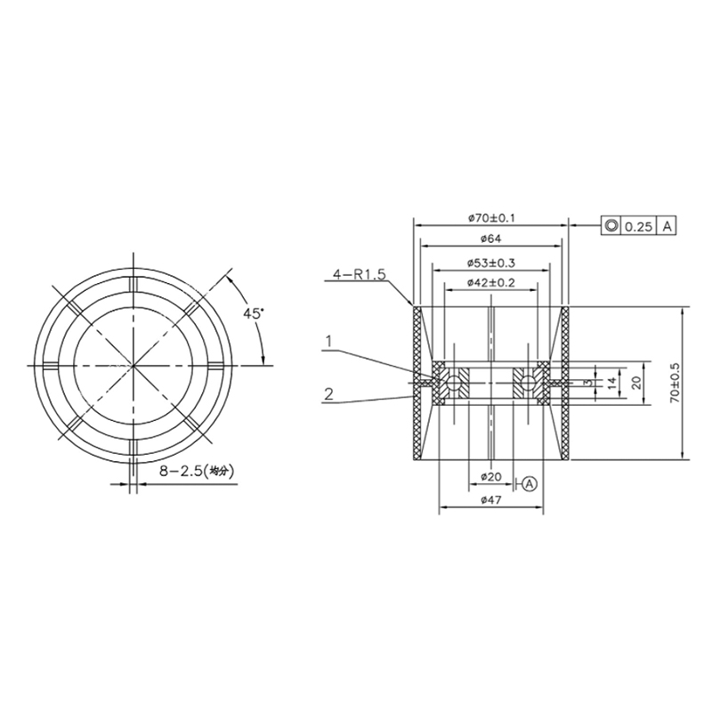 غلتک نگهدارنده دارای قطر 70 میلی متر و ارتفاع 70 میلی متر است. مجهز به بلبرینگ 6204 است. این بلبرینگ دارای قطر داخلی 20 میلی متر، قطر خارجی 47 میلی متر و ضخامت 14 میلی متر است. می تواند بارهای شعاعی و محوری بزرگ را تحمل کند و سرعت چرخش بالایی را امکان پذیر می کند. ساخته شده از مواد نایلون، مقاومت در برابر سایش، مقاومت در برابر خوردگی، مقاومت در برابر ضربه و روانکاری عالی دارد. غلتک فشار نایلونی می تواند عملکرد انتقال پایدار را در طول چرخش حفظ کند و لرزش و نویز را کاهش دهد.